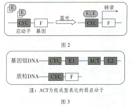 图 3 中 E2 基因持续性表达少量的 E 蛋白时,酵母细胞具有接受蓝光刺激的能力,E1 基因的作用是蓝光照射后,