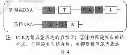 。(4)制药过程中需避免工程菌泄露到环境中引发基因污染。科研人员利用两种阻遏蛋白基因(T 和 L)和调控元件,使酵母细胞在红光和蓝光同时照射时才激活致死基因 N 的表达,进而诱导工程菌死亡,如图 4。