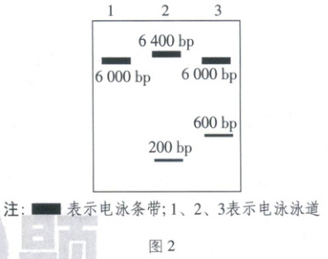 (2)酶切后的载体和基因X进行连接,可产生3种连接产物:单个载体自连、基因X与载体正向连接、基因X与载体反向连接(如图1所示)。为鉴定这3种产物,选择EcoRⅠ酶和HindⅢ酶对筛选得到的载体进行双酶切,并对酶切后的DNA片段进行电泳分析,结果如图2所示。图中2泳道对应的载体的连接方式是