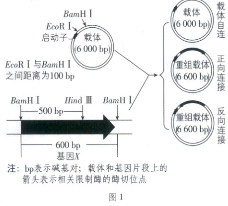 (填限制酶)。(2)酶切后的载体和基因X进行连接,可产生3种连接产物:单个载体自连、基因X与载体正向连接、基因X与载体反向连接(如图1所示)。为鉴定这3种产物,选择EcoRⅠ酶和HindⅢ酶对筛选得到的载体进行双酶切,并对酶切后的DNA片段进行电泳分析,结果如图2所示。图中2泳道对应的载体的连接方式是