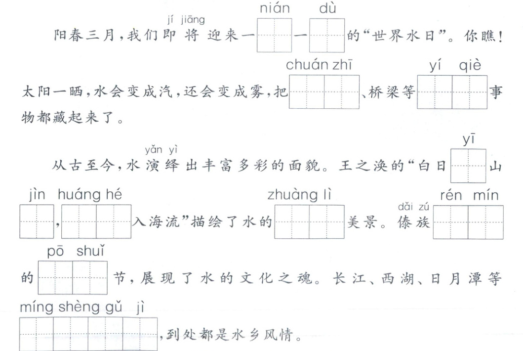 年度 船只 一切 依 尽 黄河 壮丽 人民 泼水 名胜古迹 【点评】本题考查在具体语境中看拼音写字词的能力。根据所学拼音知识进行拼读,写出相应的字词即可。拼读时要注意所给音节的声母、韵母及声调。