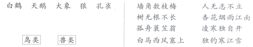 鸟类:白鹤 天鹅 孔雀 兽类:大象 狼 墙角数枝梅——凌寒独自开 树无根不长——人无志不立 孤舟蓑笠翁——独钓寒江雪 白马西风塞上——杏花烟雨江南 示例:胆小如鼠