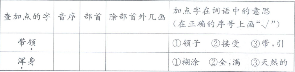 L 页 5 ③ H 氵 6 ② 【解析】本题考查查字典的能力。答题时注意音序和声母的区别,音序是拼音首字母的大写。“领”的声母是l,音序是L;“浑”的声母是h,音序是H。在辨析字义时,要结合具体的词语含义去分析。