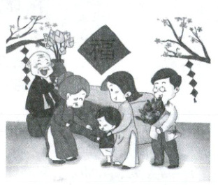 小朋友们,在我国的春节,还有一件很有意义的活动,那就是“拜大年”。请你仔细观察图片,看看春春一家是如何拜年的。图中都有哪些人?他们会说些什么,做些什么呢?先说一说,再写一写。150字左右。