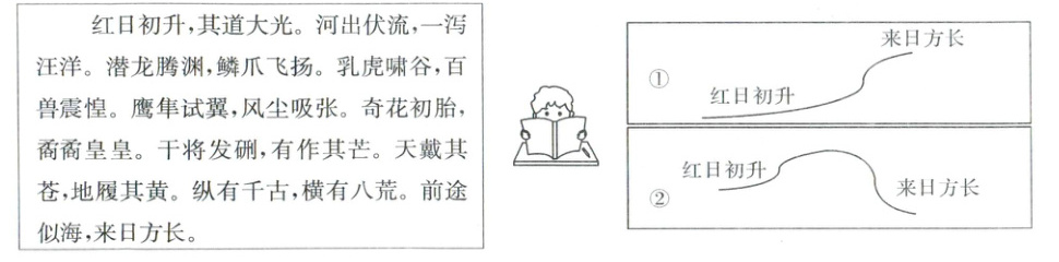 (1)①【解析】本题考查对朗诵语气的掌握。这段文字用了很多自然意象,比如红日、河流、潜龙、乳虎、鹰隼、奇花,还有干将剑,这些都是充满力量和朝气的象征。作者通过这些意象来表现少年中国的蓬勃发展和光明未来。整体基调应该是上扬的,因为内容积极向上。每一句末尾可能需要稍微上扬,尤其是四字短语,比如“其道大光”“一泻汪洋”,这些词语要读得有力,体现出气势。所以整体情感应该是激昂、充满希望的。故选①。