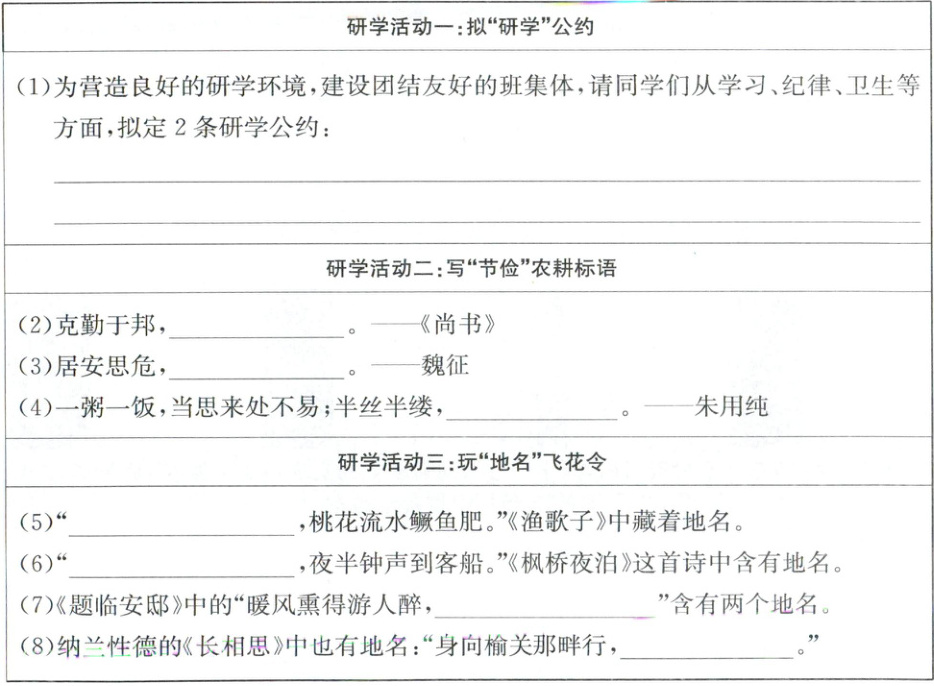 (1)示例:①自觉维护环境卫生,不乱扔垃圾,积极参与清理活动现场。②要遵守纪律,相互帮助,组成学习小组,共同进步。【解析】本题考查拟定公约的能力。本题要求从学习、纪律、卫生三个方面拟定研学公约。在学习方面,公约应鼓励同学们专心听课和讨论,保证学习任务按时完成;在纪律方面,公约应强调守时、爱护公共设施以及保持安静的必要性。根据这些原则,分别列出具体的条款,以确保全班同学共同遵守,营造一个良好、和谐的研学环境。如:①认真听从老师的指导,积极参与讨论,按时完成研学任务。②遵守时间安排,爱护公物,不扰乱秩序,共同维护研学环境的整洁与安静。