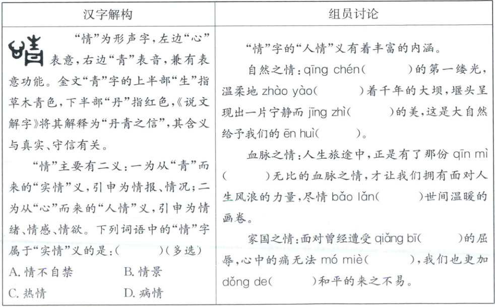 2. 汉字溯源头:了解“情”的汉字解构并补全下面的活动记录卡。(10分)