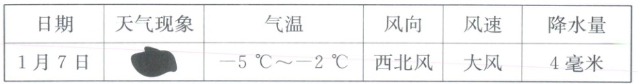 10. 下表是小科同学 1 月 7 日的天气观测记录情况,其中有一部分被墨水污染,根据当天其他天气信息,你判断这天的天气现象最有可能是(