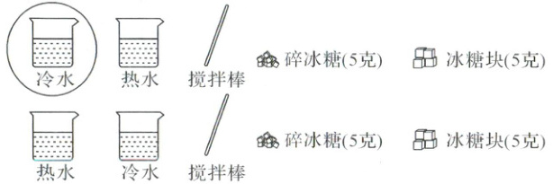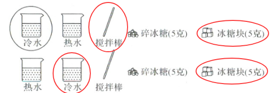1.圈出冷水、一根搅拌棒、两份冰糖块(或碎冰糖)(5克)