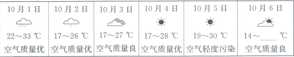 国庆假期,小科的爸爸计划去露营。小科非常期待能够去露营,于是在爸爸手机上查到了近几天的天气预报,并对天气预报信息做了如下记录,请根据学过的天气知识回答下列问题。