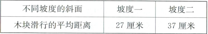 (4)如果给坡度二中的木块装上轮子,那么木块被撞击后运动的距离会(