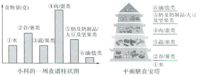 (1)小科的一周食谱柱状图显示,摄入食物量最多的种类是(