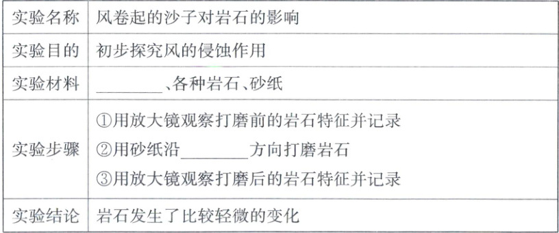 ,用砂纸打磨岩石的过程模拟风卷起沙子不断磨蚀岩石