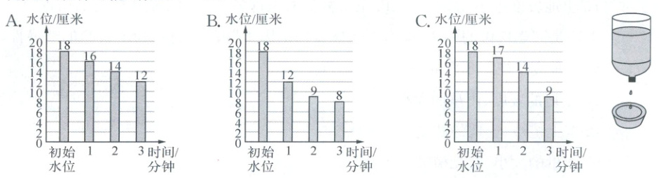 12. 测试如右图的水钟后发现,该水钟不能保持匀速滴水。上方塑料瓶中水位与时间的变化关系最有可能的是(