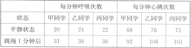 3. (湖州市南浔区)某探究小组对“运动对肺和心脏的影响”进行研究。测量小组内三位同学运动前后呼吸和心跳的次数,得到的数据如下表所示: