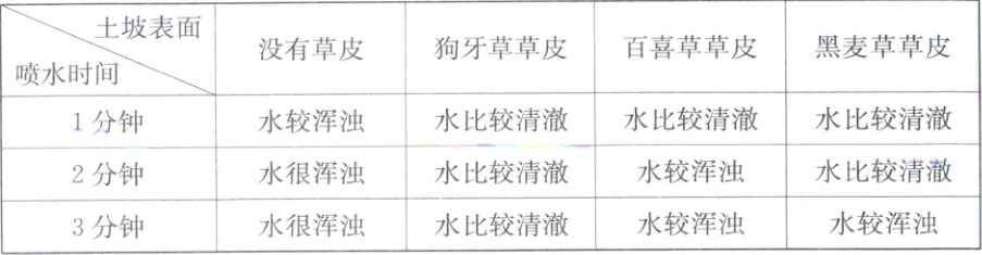 (3)小科看到在河两岸有塌方的现象,有些塌方的地方种了一些草本植物,他了解到这些草本植物能有效地保持水土,避免再次塌方。为了研究不同草本植物对土壤侵蚀作用的影响,小科找来了 3 种类型的草皮,将草皮放在土壤做的小山坡模型上,并用喷壶在顶部喷水,测试它们保持水土的能力,结果记录如下: