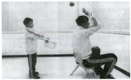 2. 如上图所示,抛沙包瞬间,b 处上臂肌肉的变化情况是( )。