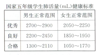 11. 趁游戏中的休息时间,小科测量了肺活量,测量结果是 2854 mL,对照国家学生体质健康标准(如右表),他的等级是(