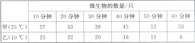 1. 同学们自己培养微生物进行观察,把培养液分成了等量的甲、乙两杯,每隔10分钟取等量的培养液观察一次,观察记录如下表。(5分)