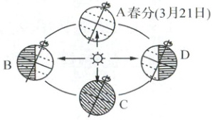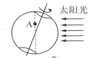 (3)右图是航天员某天看到的地球上的A地区,请根据地球自转方向推测:此刻居住在A地的人们处于______(填“日出”或“日落”)时刻。并将图中处于夜晚的区域涂成