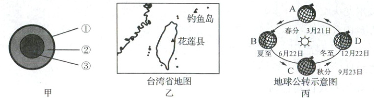 。(填序号)(2)6个小时后花莲县将迎来日出,观察乙图,花莲县迎来日出时我国的钓鱼岛是(