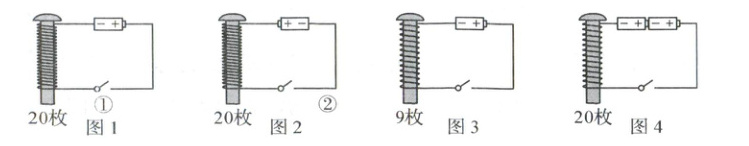 小明研究影响电磁铁磁性强弱的因素。他将导线分别绕在完全相同的四个螺栓上,制成电磁铁。下图所示是四个电磁铁电路,以及通电后吸引的回形针数量。