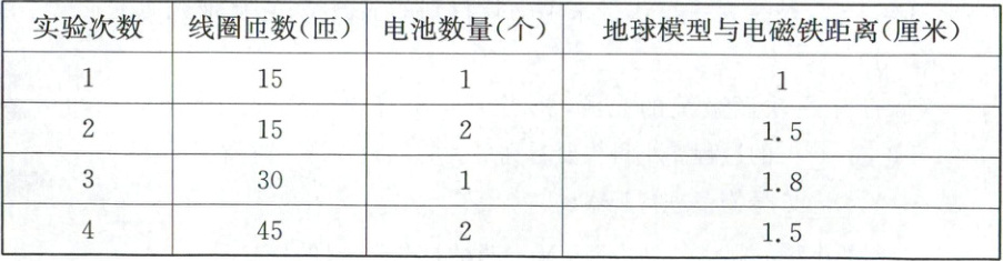 次实验数据可能存在问题,你判断的理由是第4次实验与第2次实验电池数量相同,但第4次实验线圈匝数更多,地球模型与电磁铁的距离应比第2次实验要大(合理即可)
