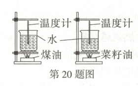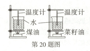 20. 实验小组利用如图所示的相同装置探究煤油和菜籽油的热值大小关系,其中煤油和菜籽油的质量相同(实验在一个标准大气压下进行)。