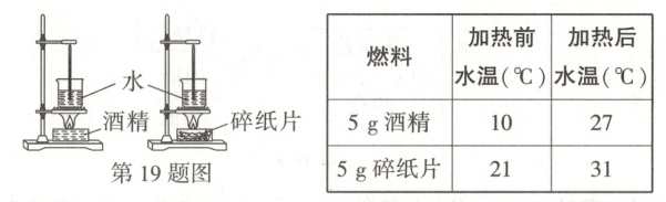 19. 小明想比较生活中常见物质的热值大小,用酒精、碎纸片各5g,组装了如图所示的实验装置。