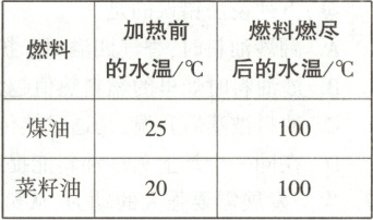 (2)改正错误后开始实验。在两燃烧皿中分别加入等质量的煤油和菜籽油,读出两烧杯内水的初温,同时点燃煤油和菜籽油,将得到的实验数据记录在表格中(无读数错误)。