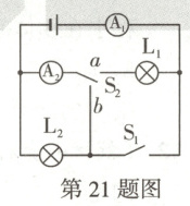 (2)当闭合S₁,S₂接a时,电路为灯泡L₁、L₂的并联电路,电流表A测量通过灯泡L₁的电流,则通过灯泡L₁的电流I₁=0.18A ……(2分)