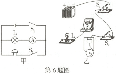 6. 如图甲所示为报警器的简易电路图,请你按照该电路图将图乙中实物电路连接完整.