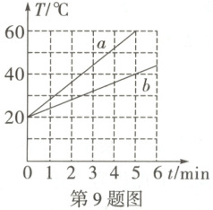 9. 小明用相同的电加热器分别对相同质量的液体 a、b 进行加热,得到如图所示的图像. 已知 b 液体的比热容为 $ 4.8 × 10^3 \, J/(kg · ° C) $,a 液体的比热容为