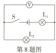 8. 如图所示电路,电源电压为 6 V 且保持不变,当开关 S 闭合时,灯泡 $ L_1 $、$ L_2 $ 均正常发光,电压表示数为1.5 V,则灯泡 $ L_1 $ 两端的电压为