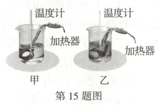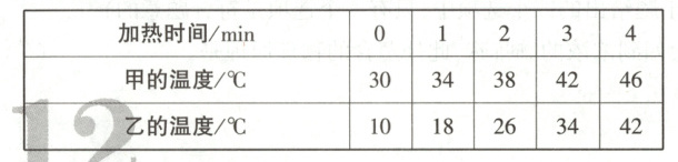 15. 在探究“比较不同物质的吸热能力”实验中,某小组的同学利用如图所示装置进行实验. 所用器材有:两个相同的烧杯、两个规格相同的电加热器、初温不同但质量相同的两种液体. 实验过程中,每隔 1 min 读取一次温度计的示数,并记录在表格中,如表所示. 已知 $ c_{甲} = 4.2 × 10^3 \, J/(kg · ° C) $,下列说法正确的是 ()
