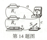 14. 在“探究并联电路电流规律”的实验中,如图所示是测量支路电流的电路图. 小明想通过改变“a”“b”“c”三根导线与电流表相接的位置,从而测量出干路电流(干路电流不超过 0.6 A),下列操作中可行的是 ()