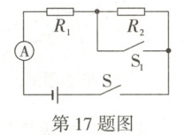 17. 如图所示电路,电源电压为 3 V,$ R_2 $ 为 6 Ω,当 S 闭合、$ S_1 $ 断开时,电流表的示数为 0.3 A,再闭合开关 $ S_1 $ 后,下列说法正确的是 (