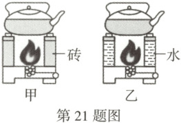 21. (2022 版课标素材改编)一些地区的人们用砖砌成炉灶来加热水,如图甲所示,水壶装满水时水的体积为 2 L,已知炉灶的热效率为 25%. [ 焦炭的热值为 $ 3.0 × 10^7 \, J/kg $,$ \rho_{水} = 1.0 × 10^3 \, kg/m^3 $,$ c_{水} = 4.2 × 10^3 \, J/(kg · ° C) $ ]求: