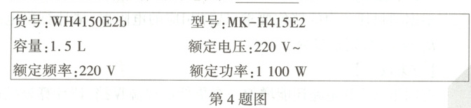 4. 小丽观察到妈妈新买的电热水壶的铭牌如图所示,根据铭牌信息可知电热水壶正常工作时的电流是