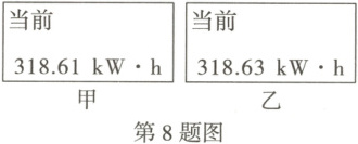8. (教材练习改编)小明家当前电能表的表盘示数如图甲,用电高峰期时,他断开家中除该饮水机外的其他用电器,让饮水机加热90s后,发现电能表示数如图乙。则该饮水机的实际加热功率为