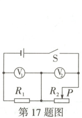 17. (全国新考法·逆向思维)如图所示电路中,电源电压保持不变。闭合开关S,在保证电路元器件安全的前提下,移动滑片P的过程中,电压表V₂示数变大,则(