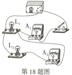 18. 如图所示实物图,电源电压为6V,闭合开关后,电流表A₁与A₂的示数分别是0.6A、0.3A,若灯泡灯丝的电阻不受温度影响,将电源电压调节至4V后,下列说法正确的是(