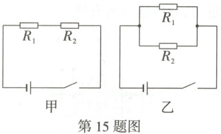 15. 现将电阻为R₁、R₂的两个电阻器分别按图甲、乙两种方式接入电路中,已知两电阻器的电阻分别为R₁ = 3Ω,R₂ = 6Ω,电源电压均为6V。闭合开关,下列说法正确的是(