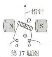 17. 图为小明自制的一个电流表的内部简易模型图,图中N、S极为永磁体的两个磁极,绕在塑料上的线圈和指针成一定的角度固定在一起,a、b是简易电流表的接线柱,下列说法正确的是(