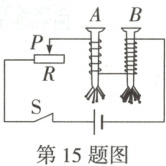 15. (全国新考法·提出问题)图为小周“探究电磁铁磁性强弱的影响因素”的实验装置。闭合开关S,他实验发现A端大头针数目比B端大头针数目少,则说明电磁铁的磁性强弱与什么有关(