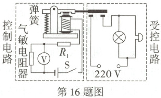 16. 图为小明设计的天然气泄漏检测电路的原理图。控制电路中包括电压恒定的电源和电阻为R₁的电阻器,当天然气浓度增大到一定值时,受控电路报警。则(