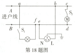 18. 如图所示的家庭电路中,正在工作的电动机突然停止工作,用测电笔测试插座的N、L两个插孔,测电笔氖管都发光,闭合开关S₁,灯泡正常发光。若电路只有一处故障,下列说法中正确的是(