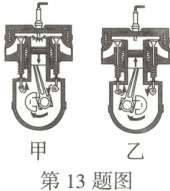 13. 如图所示是单缸四冲程汽油机在工作时的两个冲程,下列说法正确的是(