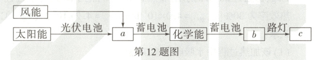 12.(教材练习改编)新农村建设过程中采用风光互补路灯,它“头顶”小风扇,“肩扛”电池板,“腰挎”照明灯,“脚踩”蓄电池。如图是该路灯工作时的能量转化图(a、b、c分别表示某种形式的能量),下列判断正确的是(