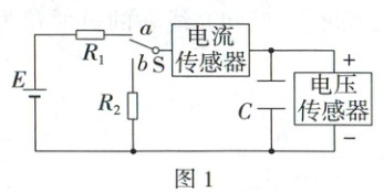 开关S接$a$,电源与$R_{1}$、电流传感器、电容器组成闭合电路,为充电过程